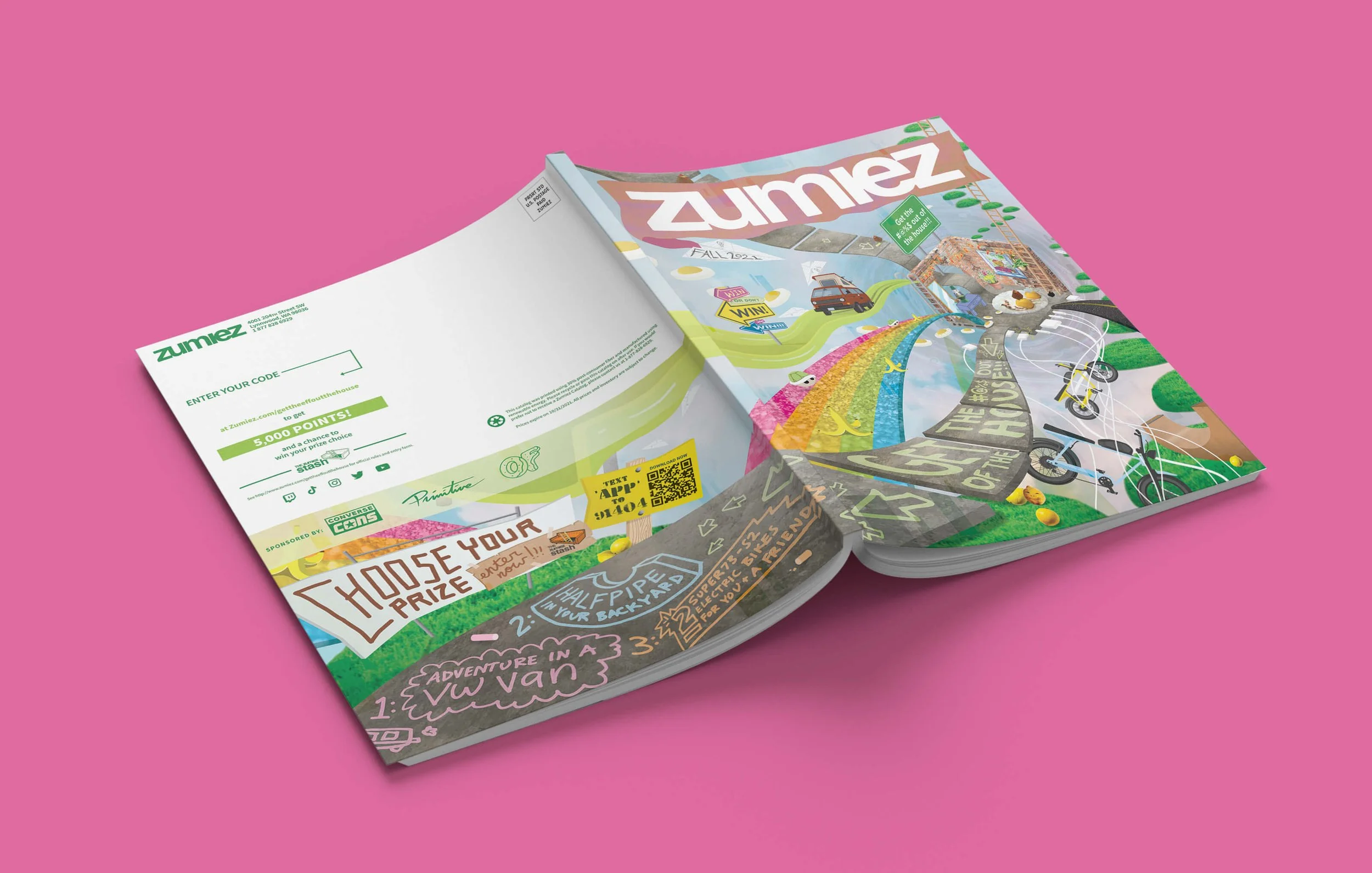 The Fall 2021 catalog contest offered multiple prizes with an outdoor theme. My cover illustration incorporates the bedroom from the cover of the previous issue of the catalog, and shows different ways of escaping from it to get to the prizes.